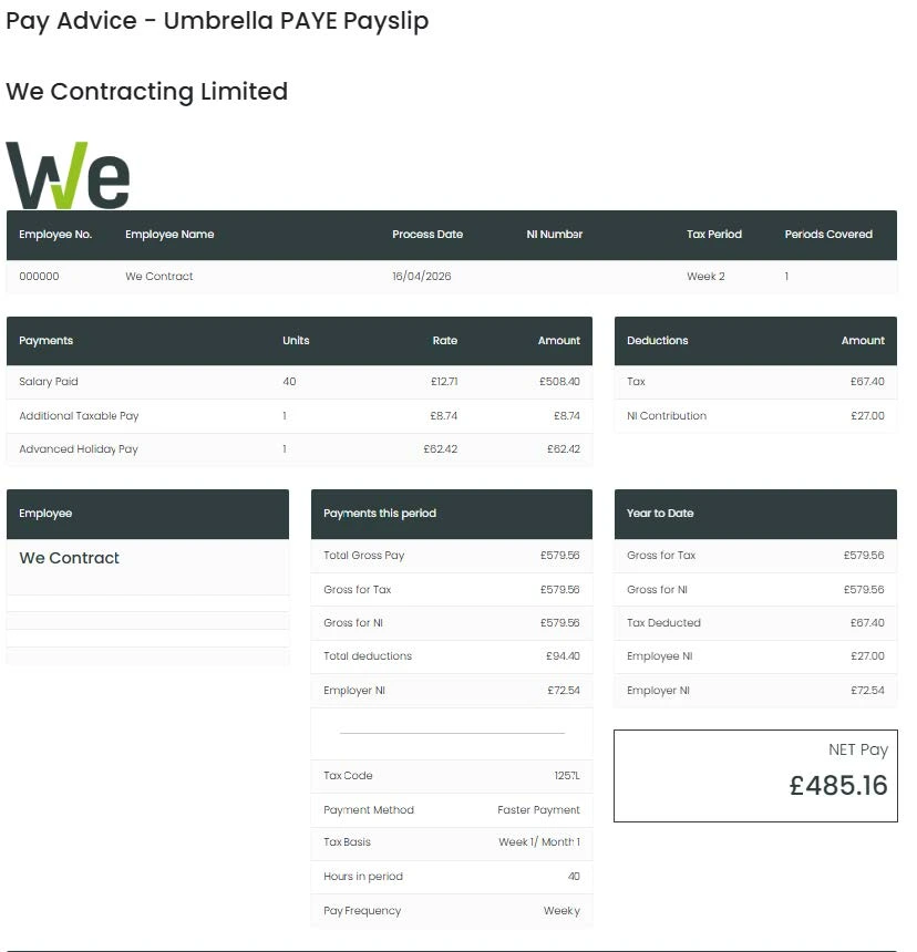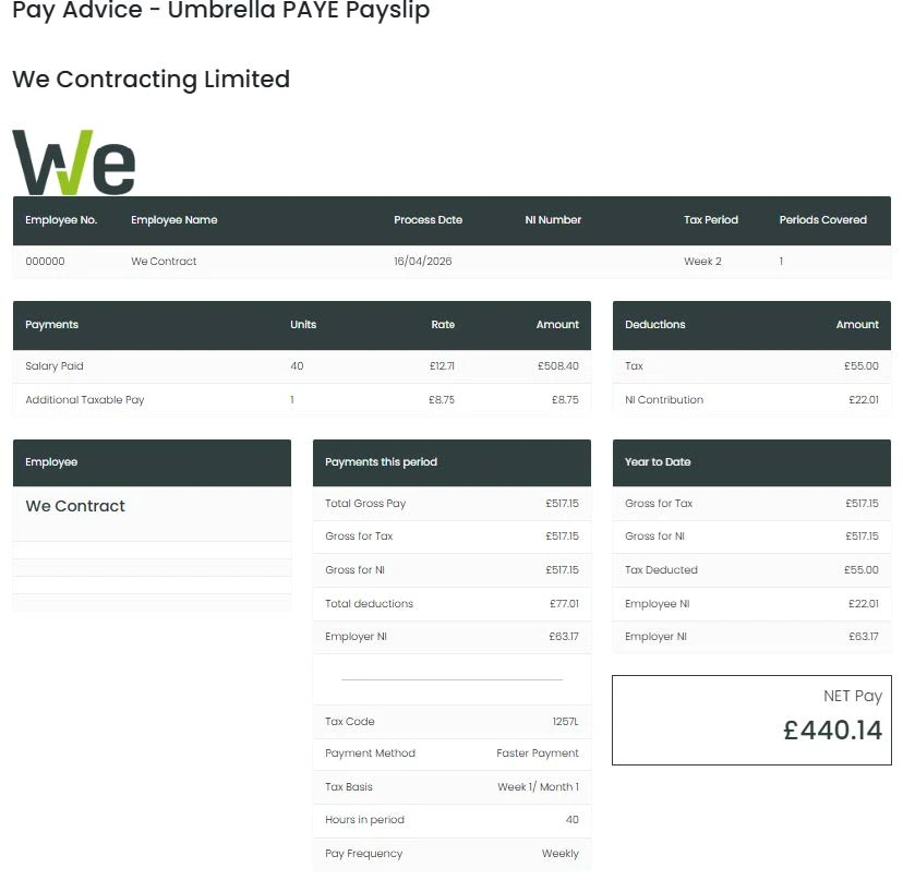 When you are paid through an umbrella company the funds, we receive from your agency include the employment costs, so the rate an agency pay you through an umbrella company is usually higher than a standard PAYE rate to accommodate this.
